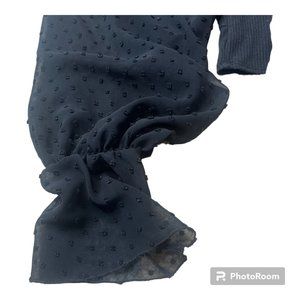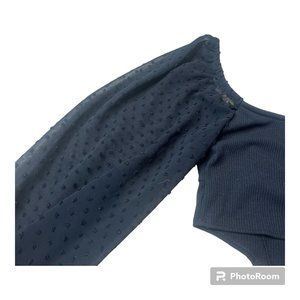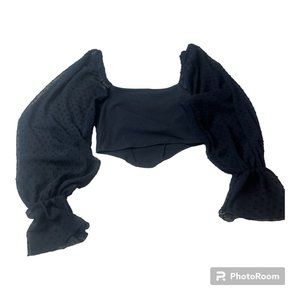 Urban Outfitters cropped long sleeve top with sheer dotted sleeves and cutout Size SMALL. Good pre-owned condition. Long balloon sleeves, sheer with dots and elastic wrists. Kind of a bustier style top with a cut out and longer in the front.