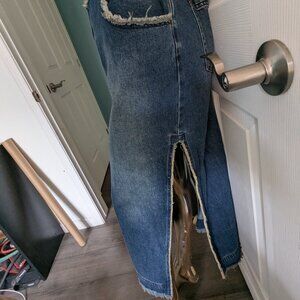 Size large. Waist: 40 cm. Hips: 50 cm. Total length: 93 cm. Dark and uneven denim. 2 pockets in front and at the back. 1 zipper and 2 buttons in front. Split on each side. Straight cut. Maxi. Distressed details.