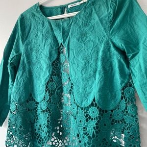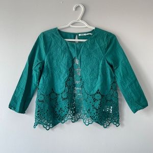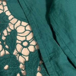 Urban Outfitters Kimchi Blue backless quarter length long sleeve blouse. Color is teal green blue. Cute and romantic floral embroidery lace. Oversized and roomy. *ties in the back have been cut, please see last photo.