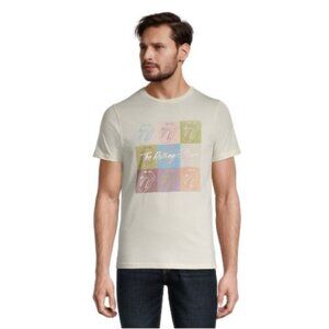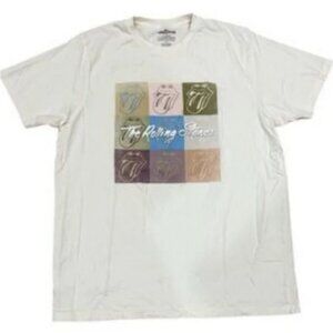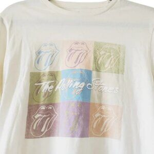 A Rolling Stones graphic t-shirt from the brand Urban Outfitters. It features the band's iconic tongue logo in a grid pattern with various colors and the band's name printed below the graphic. Graphic tees are a popular casual style and can be dressed up or down.