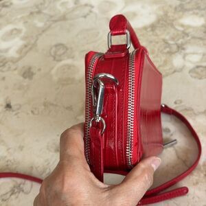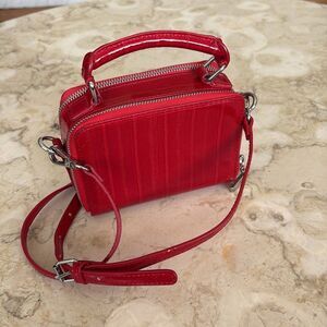 In excellent preowned condition cute red vegan faux croc embossed red leather bag. Mini satchel with top handle plus detachment adjustable strap. The bag has two zippered compartments, cloth lined and totally clean, one has several credit card slots.