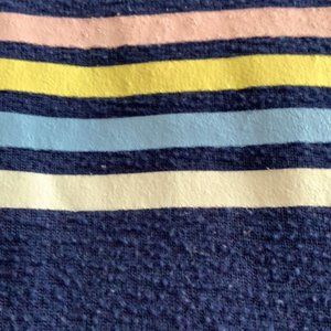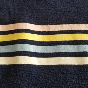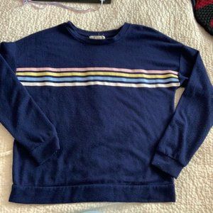 Cute sweater, super soft, great condition! A little bit of pilling is there but it can be removed with a pilling scraper or by softly dragging a razor across the pilling. Navy blue sweater with a pink, yellow, light blue, and white stripe. Size small but fits oversized, perfect for any season. FLEXIBLE WITH PRICE.