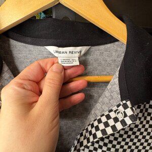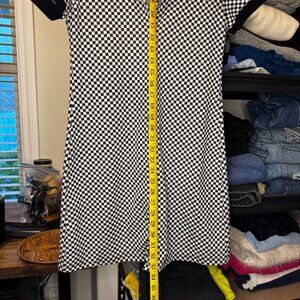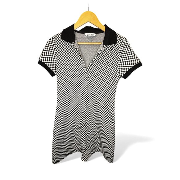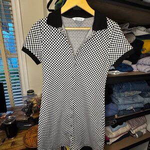 Black-and-white checker patterned dress from Urban Revivo. Has a collar and snap buttons running all the way down the front. Made from a thicker, stretchy fabric.