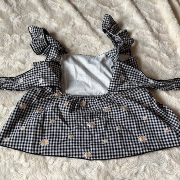 Urban romantics tank top black & white checkered with embroidered flowers. Ruffle straps, ties at back. Front bodice is lined on inside. Very good used condition, small stain on front, see last picture. Size XS. 55% cotton, 45% polyester. Handwash. Colour depends on device/screen settings and lighting in pictures.