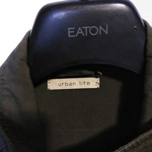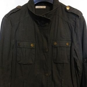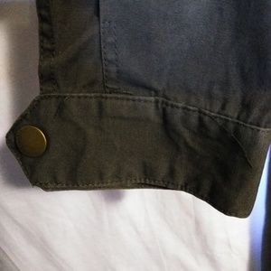 Cotton ,Green, this jacket is thin ,has zipper and buttons 2 small pockets at the top and 2 larger pocket at the bottom with flaps military looking jacket