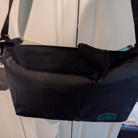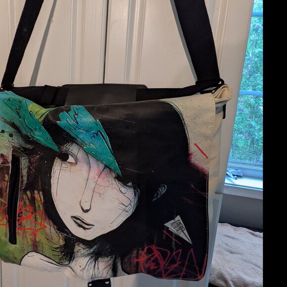 Made of 85% water bottles (polyethylene). 100% polyester interior. Can be worn on the shoulder or crossbody. The straps are adjustable. 1 front zipped pocket. Interior contains 4 compartments, including 2 for pens. Padded compartment with snap closure. The closure is a clip. The illustration is by a painter. Beige, black, and green.