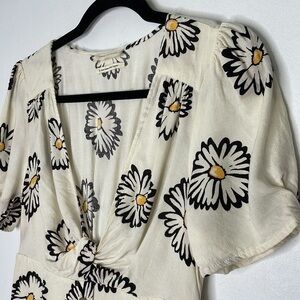 In good second hand condition gently worn. There's a snag on one shoulder and some fraying on the stitching near the back neck. Vintage-y mini dress from UO pairs a short sleeve design with an allover print. Empire waist silhouette finished with a flared hem and twist-front accent at the plunging neckline.