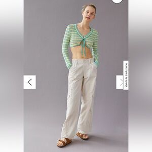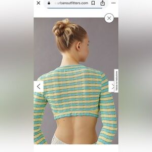 Stylish striped cropped cardigan with tie front. Features vibrant blue and yellow colors.
