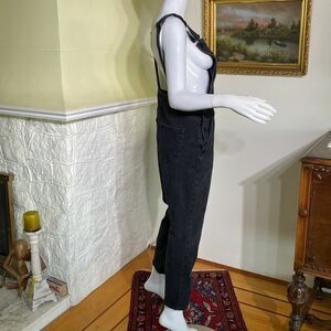 In good preowned condition BDG overalls in black, featuring front bib pocket, back pockets, slightly tapered legs, in a comfortable stretchy cotton blend. Straps can be worn straight or crossed over.