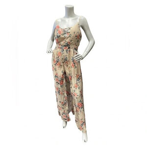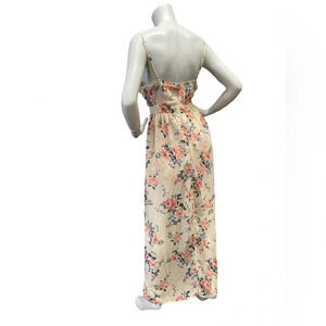 Pale peach with pretty floral pattern. This sleeveless maxi has a peek a boo skirt that reveals fully lined shorts. This dress has a zipper closure and two adjustable straps. The bodice is also lined and has bra pads. Whimsical and feminine, this is a perfect summer or vacation dress.