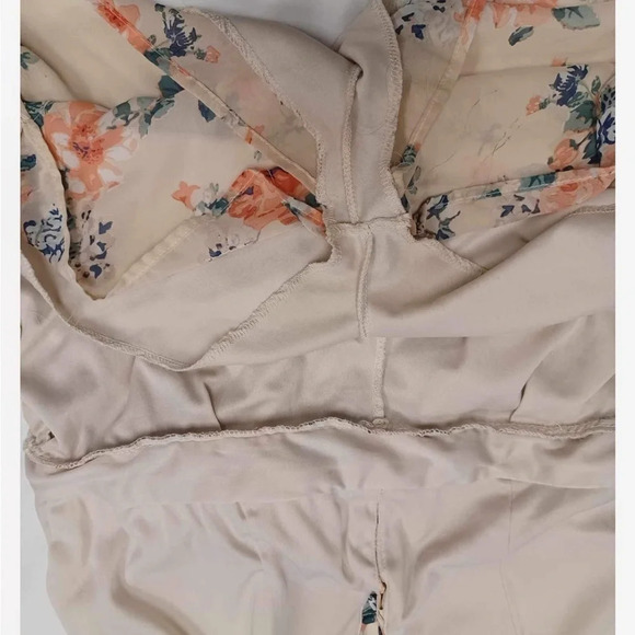 Pale peach with pretty floral pattern. This sleeveless maxi has a peek a boo skirt that reveals fully lined shorts. This dress has a zipper closure and two adjustable straps. The bodice is also lined and has bra pads. Whimsical and feminine, this is a perfect summer or vacation dress.