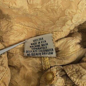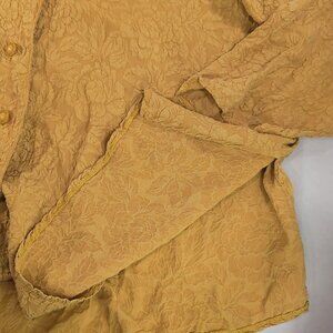 Uru 100% Silk Blouse Yellow Embossed Floral Flowers Button Textured 3/4 sleeve L