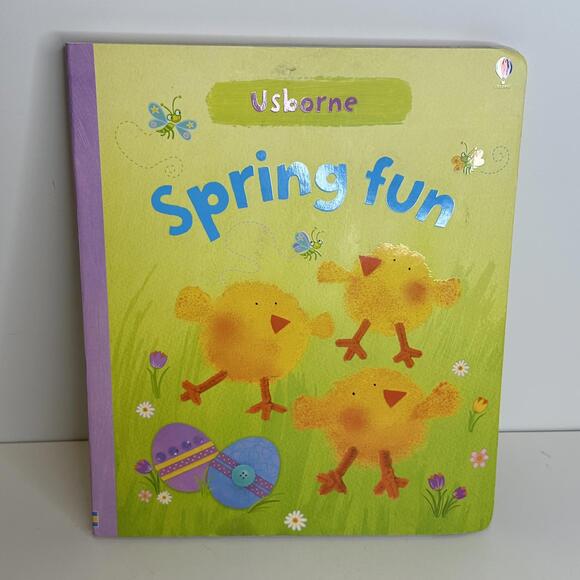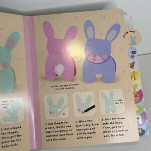 This Usborne Spring Fun activity book is designed for young children and features colorful, interactive pages with spring-themed crafts and activities. It includes cut-out shapes and instructions for making fun springtime crafts like bunny cards and springtime trees. The book is board book style with sturdy pages and tabbed sections for easy navigation.