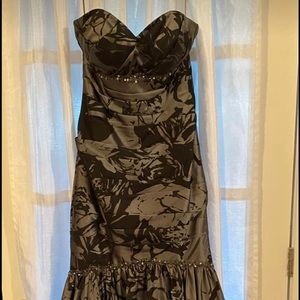 Used once for graduation. Slate grey with black floral pattern. Sweetheart neckline. Drop-waist mermaid style fit. Lace up bodice.beading embellishments.