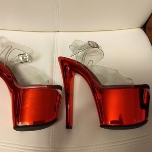 Pleaser Sky-308 Sandals in Clear-Red Chrome Size 6. These are very used stripper heels as you can tell by the pictures. I am mainly selling to anyone with a foot fetish at this point but if a woman wants to use them, that's awesome too :). I am only looking to sell my shoes without entertaining any additional requests. SOLD.