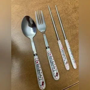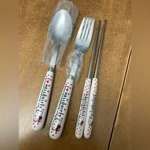 Brand new metal utensils: fork, spoon, chopsticks. Hello Kitty. Sanrio