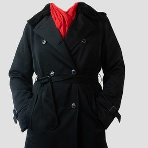 Black trench coat with detachable faux fur collar and wool liner, light and warm. Other elements include slit pockets, epolets and simple belt. The liner can be worn separately as part of relaxed and comfortable ensemble. The coat without the liner and collar can be also worn in spring. Very good condition.