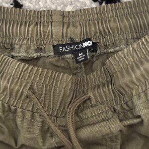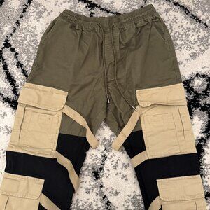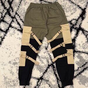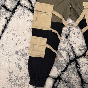 Step up your streetwear game with these statement Fashion Nova utility cargo joggers! Featuring an eye-catching patchwork design with khaki, black, and olive green panels, these pants offer both function and style. Equipped with multiple oversized cargo pockets and strap detailing, these joggers are perfect for bold, fashion-forward looks.
