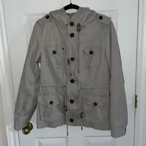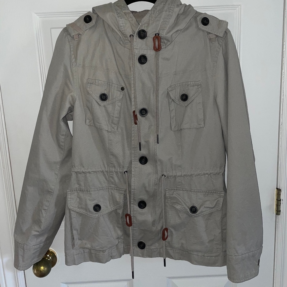 Size M beige utility jacket with zipper and buttons.