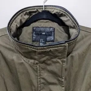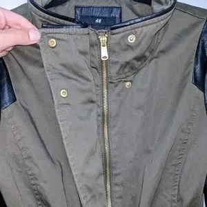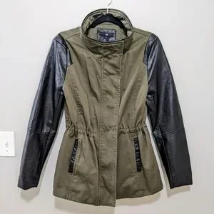 Utility style jacket with faux leather sleeves. Faux leather trim detail at collar and pockets. Inner drawstring. Zipper and snap closure.