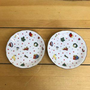Set of 2 Utsuwakan by Maebata mini 4" saucers have cute Christmas all-over design. Good pre-owned condition: gold color edging is worn away in a few small spots.