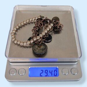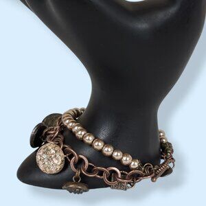 This vintage 2-strand bracelet is made of a copper tone metal and has a toggle clasp closure. The top strand features gold-tan tone lustrous faux pearls and the bottom strand is made of round metal links. There are a variety of vintage buttons dangling from the metal links, including on that has the appearance of glitter lucite (white sparkle, 2nd from right in pic 4) and another than has the appearance of abalone or mother of pearl (3rd from left in pic 4). The bracelet has normal wear including tone darkening. One side of the clasp has a little lock and the other side has a little heart, but there are no stamps or hallmarks that I was able to find.