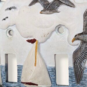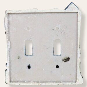 This vintage light switch cover is made of a white hard plastic-like material with a painted front depicting a lighthouse on the shore with birds flying overhead. The cover has 2 slots for light switches and has decorative 3d details throughout. The cover has normal wear including marks on the back and some dark marks in one of the clouds (see pic 3).