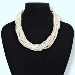 This vintage necklace has 9 beaded strands and has a loop and coin closure. The coin is a 1978 Hong Kong 50 cent coin, and the loop is made of what looks like braided wax cord. The beads are mostly all white, except for right near the clasp where they're red. I'm not sure of the bead material but it feels like wood with a lacquer, vs a solid plastic. There is normal vintage wear in the beads and some miscolouring in the clasp loop from the coin, but there are no issues that affect wearability.