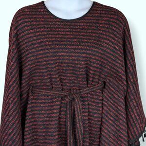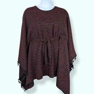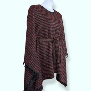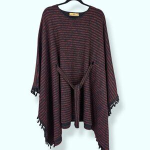 This vintage poncho is knit and basically shaped like a big square folded over with a neck hole cut in the center. The fabric has a black and red striped pattern, and the ends have small black fringe/tassels. There are a kajillion ponchos in existence, but what I like a lot about this one is that it has holes on either side of the waist to allow a belt to loop through it. Not only does this hold the piece in place, but it also gives the waist some definition and makes it look less like wearing a blanket. The piece is heavy and warms quickly. There are no issues that affect wearability. I couldn't find any information on this maker, likely because the name is not at all unique.