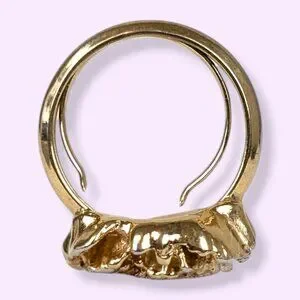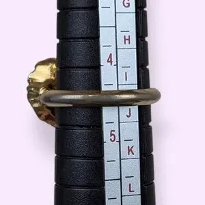 This vintage ring by Avon is made of a gold tone metal and has a fixed-size band with an "inner band" to help adjust with slight size adjustments. The ring is stamped "Avon" inside the back of the topper (see pic 5). The top of the ring is shaped like a blooming flower and has detailed petals. There is a single white/clear rhinestone off to one side. The ring has normal wear, most visible as tone loss on the back of the band (pic 7), but it is still very wearable.