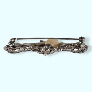 This vintage brooch by Avon comes to us from the 1990s and is made of a silver tone metal with a modern locking c pin closure. Known as "Romantic Renaissance", the brooch is almost heart-shaped and has floral details throughout. There are small cut-outs between the details, and piece is accented by small marcasite stones throughout. There is a cut-out section in the center that features a dangling off-white faux pearl drop. There is a single white rhinestone in the flower at the top center.