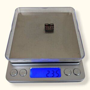 This vintage charm by Beau is made of sterling silver and has a built-in bail but has lost its original jump ring. The charm is shaped like a rectangular crate of oranges and has 8 teeny tiny "oranges" visible from either (long) side. One of the ends is stamped "BEAU STERLING" and both long sides of the charm say, "CALIFORNIA". I've seen the Florida version of this charm, but not this one. There is normal wear throughout, including the missing jump ring, the darkening patina, and superficial marks in the metal surface. Honestly, this is the cutest little charm I've ever seen, and I wasn't going to list it, but I have some sensory issues with jewellery, and this piece deserves to be loved.