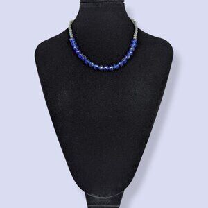 This vintage necklace is beaded and has an adjustable c clasp closure made of a silver tone metal (with the extension chain being a later addition). The necklace is strung with 2 types of beads: small faceted grey plastic beads with an AB (aurora borealis) coating, and larger spherical blue glass beads with fine faceting. The weight of the glass beads in the front helps keep the necklace facing the right direction, and the combination of the faceting and AB coating make sure the necklace picks up light beautifully. The clasp is slightly sticky but does open and does close securely.