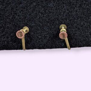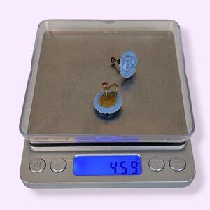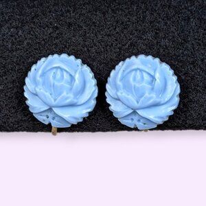 These vintage earrings have screw back findings made of a gold/brass tone metal. The fronts of the earrings are round and light blue, made of molded lucite. Each earring features a single flower in the design with some smooth curves and some more defined details towards the edges. The earrings have wear, most visible in the metal backings. There is tone darkening/distress, some oxidization I could not remove, and one backing is slightly bent out of shape.