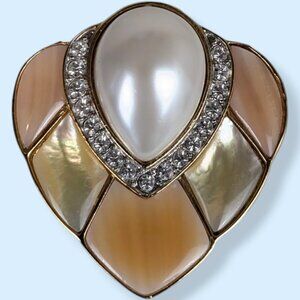 This vintage piece by Butler can be worn as a necklace or, if so desired, the pearly section can be removed, and the bottom piece can be worn as a brooch. The pearly section attaches by a toggle clasp on either side bottom piece (4th picture). The bottom (brooch) piece has a modern locking c pin closure on the back and is stamped Butler at the very bottom. The pearly beads have a good weight and feel to them, but I believe they're faux pearls. The brooch pearl is also faux, with white/clear rhinestones and enamel. The necklace has normal vintage wear but nothing that affects wearability.
