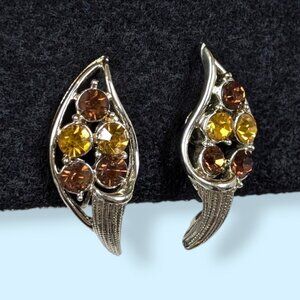 These vintage earrings by Coro are made of a silver tone metal and have clip on backings stamped Coro on the backs. The earrings are mirrored, each shaped like a swoopy leaf. The bottoms are pointed and solid in appearance, with 5 rhinestones in each side (3 brown, 2 orange). There is normal wear and some tone fade, but the pair is very wearable and perfect for fall.