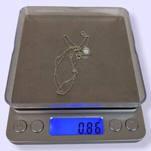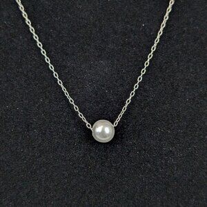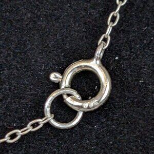 This vintage necklace has a dainty chain made of sterling silver and has a c clasp closure stamped 925. The chain is adjustable with 3 rings/options rather than a chain that can be adjusted at any point. The pendant is a simple spherical plastic faux pearl bead that is strung through its center and can move freely along the chain. There is normal wear and, worth mentioning, I found that the daintiness of the chain means it likes to tangle.
