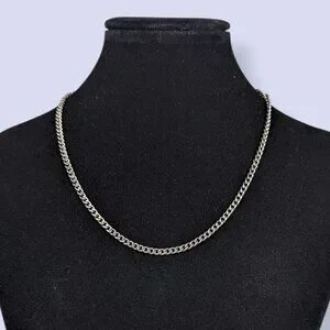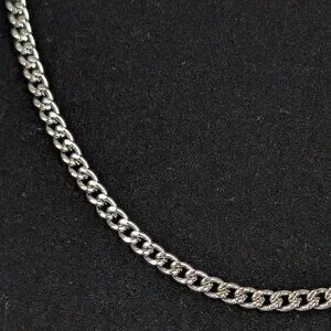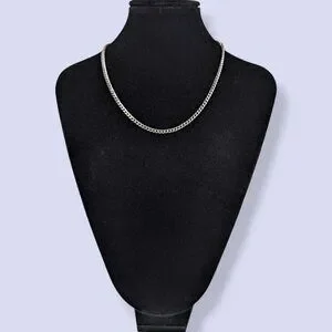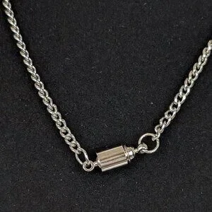 This vintage chain necklace is made of a silver tone metal and has a magnetic screw clasp. The chain is thin and dainty but sturdy and has flat, textured links. There is normal wear, including some superficial marks in the surface of the clasp metal, but no issues affecting wearability.