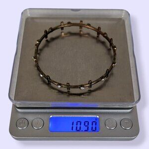 This vintage bracelet is made of a darkened gold tone / brassy tone metal and is a fixed-size bangle. The design of the bracelet is metal crosses all the way around, each separated by a single white/clear rhinestone. There is wear throughout, most visible as tone darkening and superficial marks in the metal, giving it a distressed appearance.