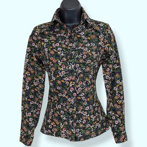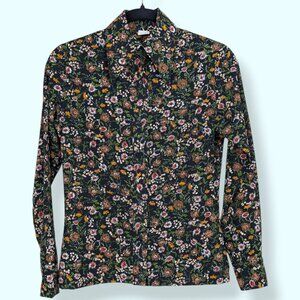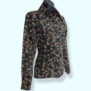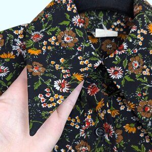 This floral long sleeve shirt by Elite doesn't have a tag listing material content but the fabric is lightweight, and my best guess is a cotton/polyester blend. The shirt has buttoned cuffs, a full buttoned front, and a pointed, exaggerated collar (see pic 4). The background colour of the shirt is a dark blue-ish black, and the flowers are red, white, and yellow with green foliage. As mentioned, the top is lightweight and comfortable to wear, but doesn't have much stretch in the fabric, if any at all. There is normal wear, including the loss of some of the tags inside, but is still very wearable.