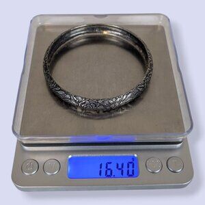 This vintage bangle bracelet is made of a silver tone metal and is in a fixed shape. The bracelet has a smooth concave interior and a beautifully detailed embossed floral exterior. The patina is dark and even, and is especially dark inside. There is normal wear, but the patina is the most visible sign.