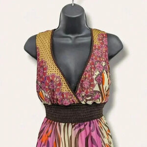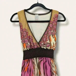 This vintage piece by Estam is a bright and colourful lightweight dress. Featuring a white skirt lining, low v-neckline, and two long pieces of fabric that tie behind the back, one sewn in on either side of the waist.