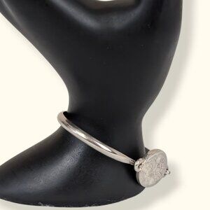 This vintage bracelet is made of a silver tone metal and has a latch-front opening. The band of the bracelet is thin, smooth, and more rectangular than circular. The oval-link piece at the front is etched with the image of what appears to be a bird? Or a dragon? I'm not 100% sure. The bracelet has normal wear, including superficial marks in the surface of the metal. It also has more visible wear in the form of tone loss on the interior, both on the back of the oval-front, one the loop holding the oval, and on the interior of the band. Fortunately, the tone loss is not visible when the bracelet is being worn.