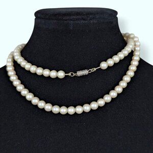 This vintage necklace is beaded and has a barrel clasp made of a silver tone metal. The necklace is strung with spherical plastic faux pearls. There is normal wear, including a little extra space on the string, presumably from missing beads (2 or 3).