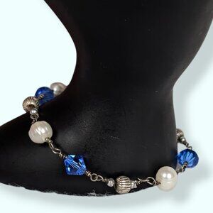 This vintage bracelet is made of a silver tone metal and has a toggle clasp closure. The bracelet is strung with beads made of blue glass, gold and silver tone metal, and white freshwater pearls (very gritty). There is normal wear, like the tone darkening of the metal, but the bracelet is very wearable.