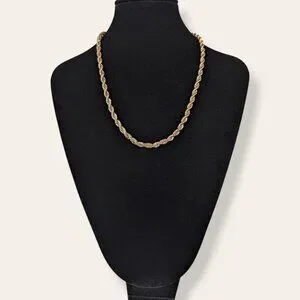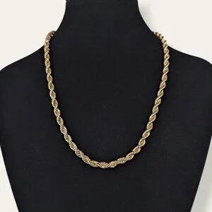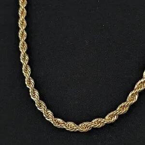 This vintage necklace is made of a gold tone metal and has an adjustable lobster clasp closure. The necklace is a sturdy rope chain with tight links and a nice weight to it. The links have smooth movement and the chain looks good by itself or as part of a stack. There is normal wear, but no issues affecting wearability.
