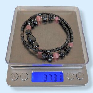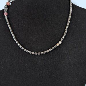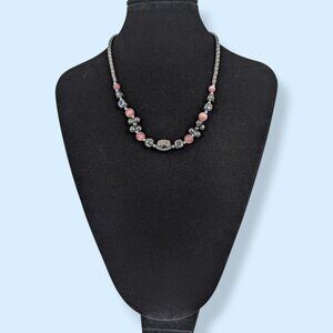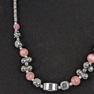 This vintage necklace is beaded and has a barrel clasp closure made of a silver tone metal. The necklace is strung with spherical pink beads (that have a little chatoyancy) and hematite beads in a variety of shapes (small cylinders, hexagonal discs, baubles, rounded cubes, etc). There are also small round spacer beads throughout. The necklace has normal wear and the pink is a nice contrast to the dark metallic silver.