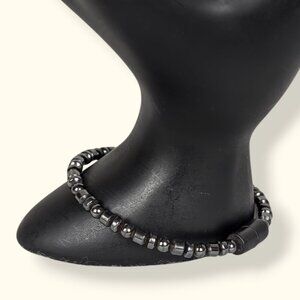 This vintage bracelet is beaded and has a magnetic closure. The bracelet is strung with beads made of hematite, some spherical and some cylindrical, but all round and small. There is normal wear, including a slight cloudiness in the surface of the beads, but no issues affecting wearability.