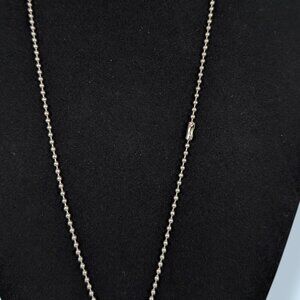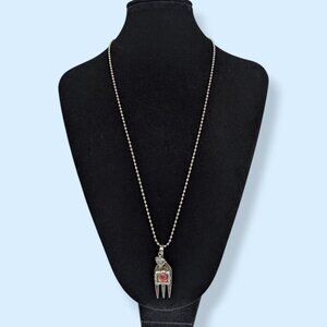 This vintage necklace has a ball chain made of a silver tone metal with a classic ball chain closure. There are two pendants hanging together to form the "I forking love you" message. The first is a small puffy heart with dark swirl details, and the other is a 3-pring fork head with a framed pink heart in its center. The fork has yellow glue residue on its back and the necklace has wear all throughout. Very cute, even if I'm interpreting the message totally wrong.