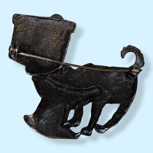 This vintage brooch by JJ (Jonette Jewelry) is made of pewter and has a modern locking c pin closure. The brooch depicts a spotted dog with a rhinestone collar drinking from a toilet. I've seen similar brooches with similar dogs, but none with spots and none with collars. There is normal wear, including tone darkening on the back, a missing rhinestone, and a bend in the pin, but no issues affecting wearability.